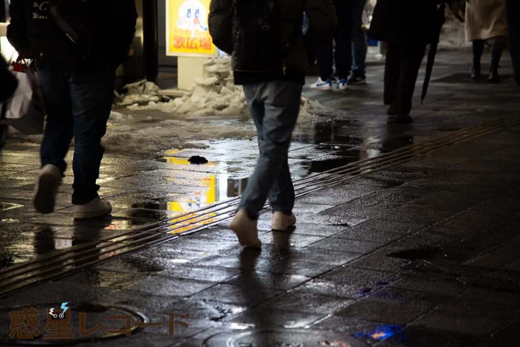 雪は中央分離帯や歩道の脇に残っていた。降り続く小雨による影響か非常に水っぽく、踏むとすぐに解けてしまう。